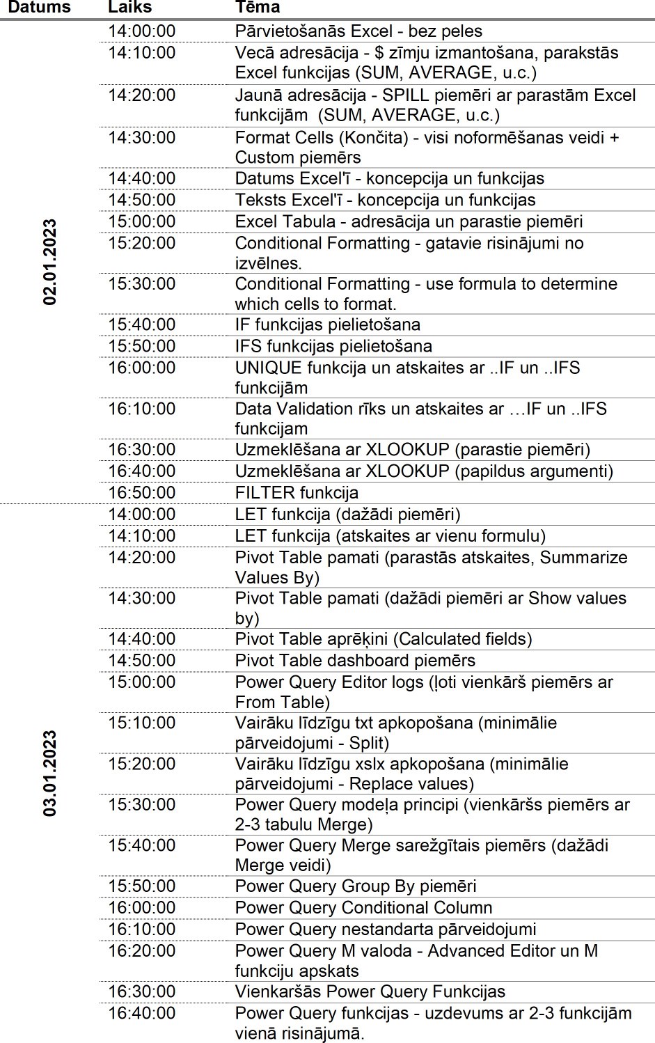 Apskatīsim un pastāstīsim par pārvietošanos, adresāciju, datumu, teksta, IF funkcijām. Veidosim atskaites ar SUMIF, COUNTIF funkcijām, PivotTable rīku. Apkoposim datus ar Power Query un glabāsim tos Excel tabulās. Mācīsim lietas, kuras 100% nākamajā dienā varēs pielietot darbā. Darīsim to konspektīvi, neatlaidīgi un precīzi. Divās dienās, 6 stundās, pāri par 30 tēmās.
