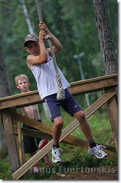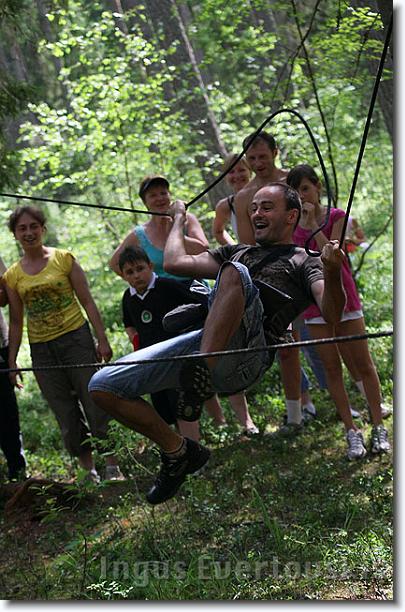 atrakcijās: augstu un zemu kokos izvietotajos virvju ceļos, pārejās